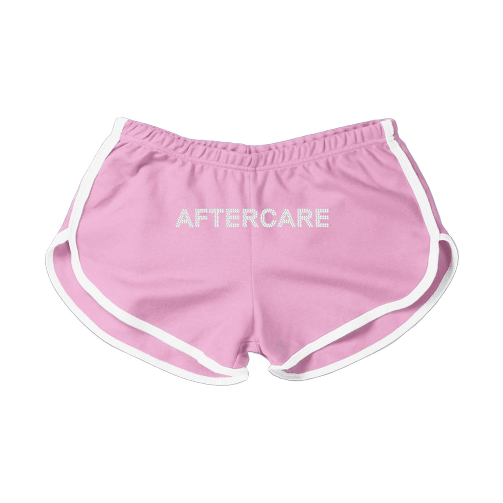 100% PINK COTTON SHORTS WITH AN ELASTIC WAISTBAND AND CONTRAST PIPING FEATURING AFTERCARE IN SILVER RHINESTONES