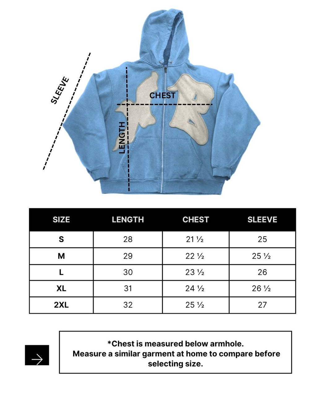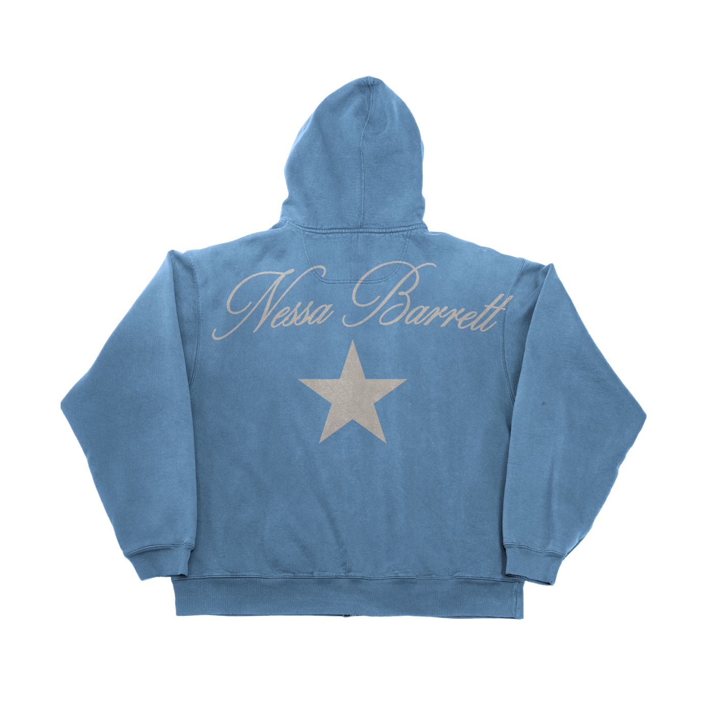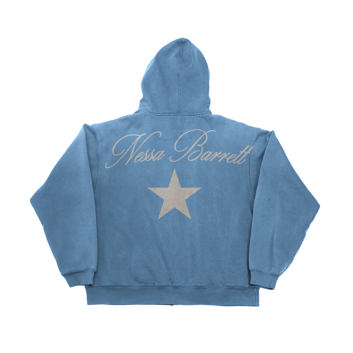 Unisex Zip Up Hooded Sweatshirt with light grey, fabric "NB" patch on front and a screenprinted graphic on the back. 60% Cotton / 40% Polyester
